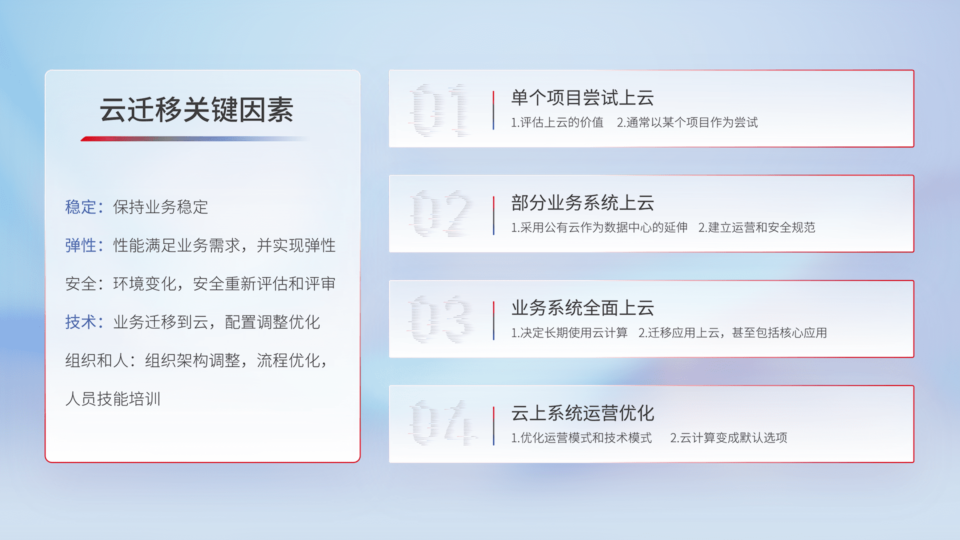 结合实际业务,,,从规划设计、、云平台选型、、云原生改造、、、数据迁移、、、、集成交付,,,,迁移全过程为客户识别最佳上云路径,,,,做好风险识别管理,,设计网络架构、、、身份权限、、、、安全审计合规、、、、操作审计、、、、日志审计、、监控告警策略、、多站点容灾设计等,,,对云上基础设施进行整体规划,,,提升IT治理水平,,,,以满足弹性、、、、高可用、、、高性能的需求。。。