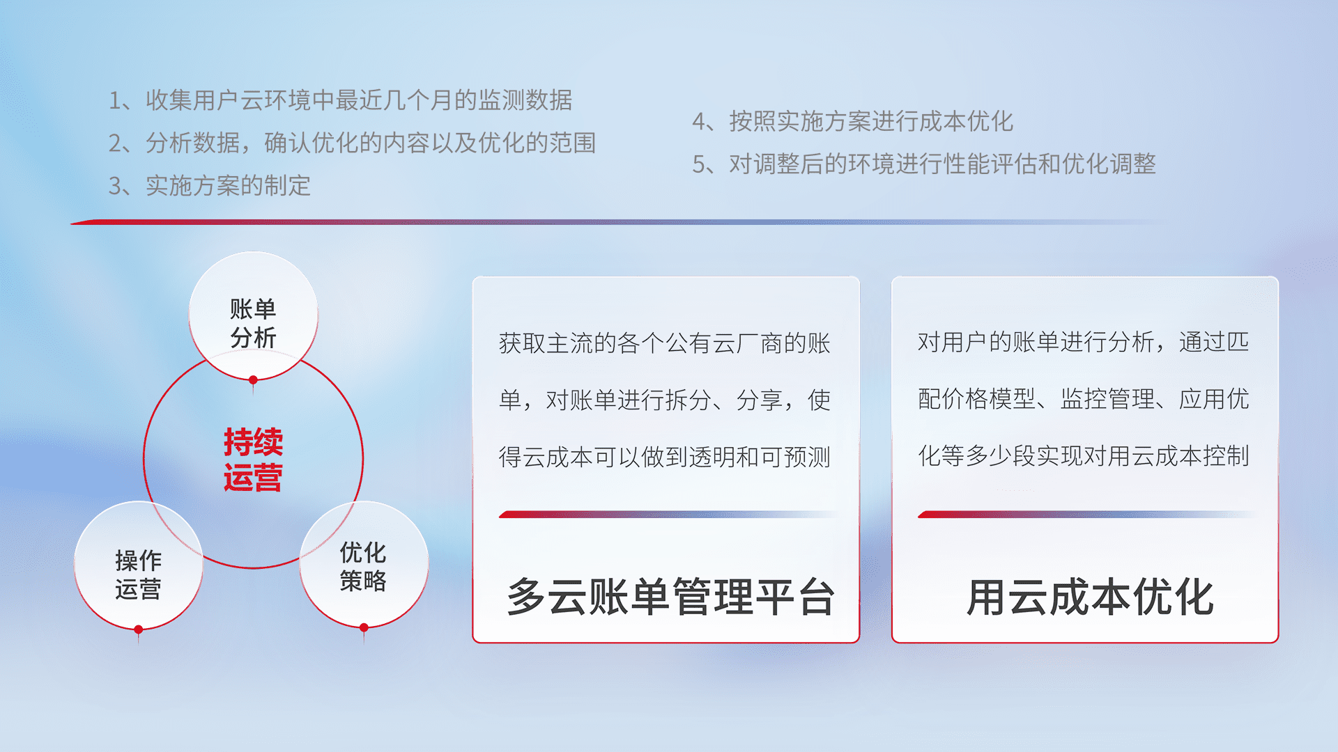 通过多云纳管,,,,以统一的资源数据模型把客户的云资源进行抽象和封装,,进而实现对多云资源的统一操作,,,保障云资源管理的可靠性、、稳定性与可用性。。。。量身定制化运维内容,,,配置、、开发运维、、补丁管理、、、备份、、监控、、认证和访问管理、、审计和日常巡检等,,保障在用云过程中的可靠度,,,稳定度以及高可用率。。